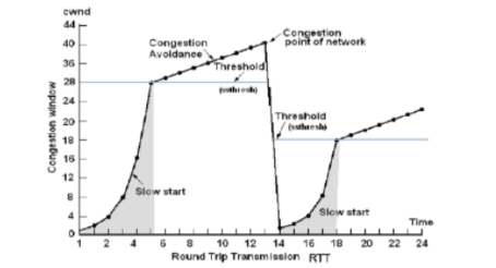 - 전송되는 데이터의 크기가 임계 값에 도달하면 혼잡 회피 단계로 넘어간다