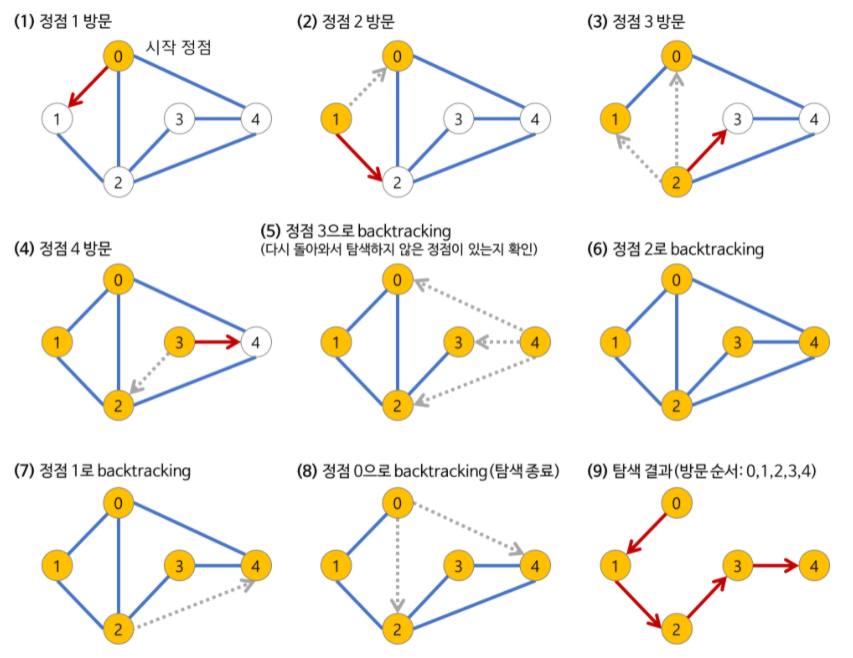 - 미로를 탐색할 때 한 방향으로 갈 수 있을 때까지 계속 가다가 더 이상 갈 수 없게 되면 다시 가장 가까운 갈림길로 돌아와서 이곳으로부터 다른 방향으로 다시 탐색을 진행하는 방법과 유사하다