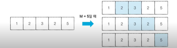 - 현재 부분 합이 M보다 크거나 같다면, start를 1 증가시킨다