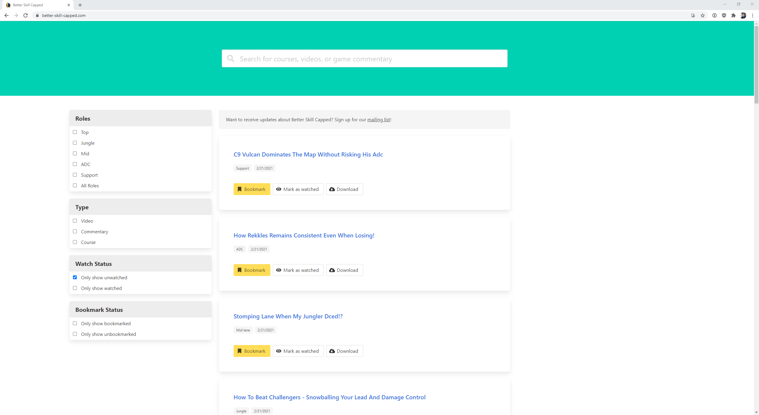 Skill Capped has some great content, but the website leaves much to be desired. It doesn't have search functionality, the video player is minimal, and figuring out what to watch next is more difficult than it should be.