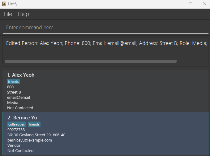 To recreate: 1) Have an entry in contact list 2) Enter command edit 1 a/Street B e/email@email p/800 <!--session: 1744358086585-da3f2957-c938-4933-a851-d9d35a62568d--><!--Version: Desktop v3.6.1-->
