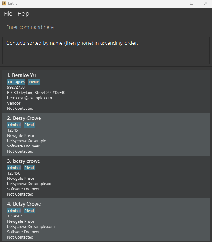 - add n/Betsy Crowe t/friend e/betsycrowe@example a/Newgate Prison p/12345 r/Software Engineer t/criminal