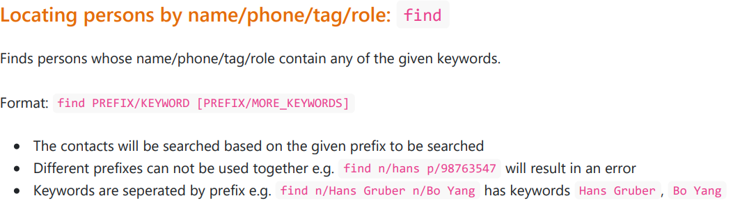 Put a list of valid prefixes under the command definition so the user will know what options they have. Could also refer users to edit command or add command to see what prefixes and fields they can search for.