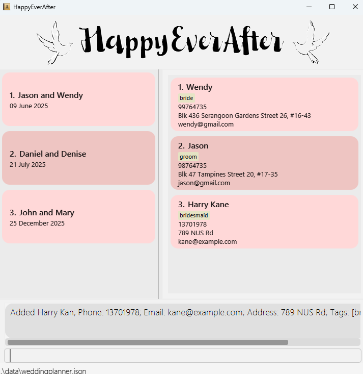 Step 2: Before adding bride and groom to the draft, open another pre-existing wedding instead using the open command (e.g. open 2)