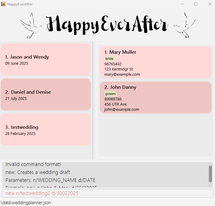 Error message on 'new' command could be more specific by identifying whether it is a formatting issue or an invalid value issue. Command used: new n/testwedding d/30022025 <!--session: 1743753821071-010f5751-abc3-476d-ba03-4f27054baafa--><!--Version: Desktop v3.6.0-->