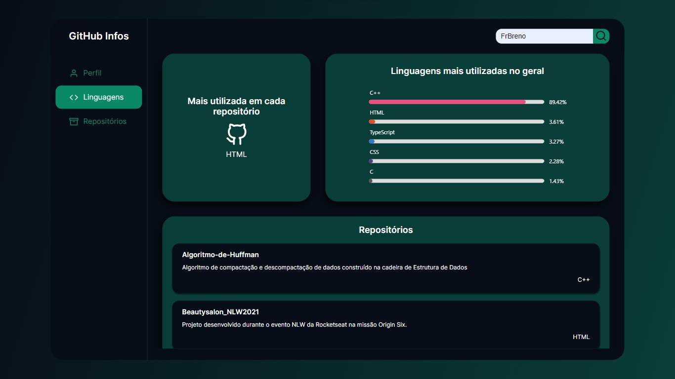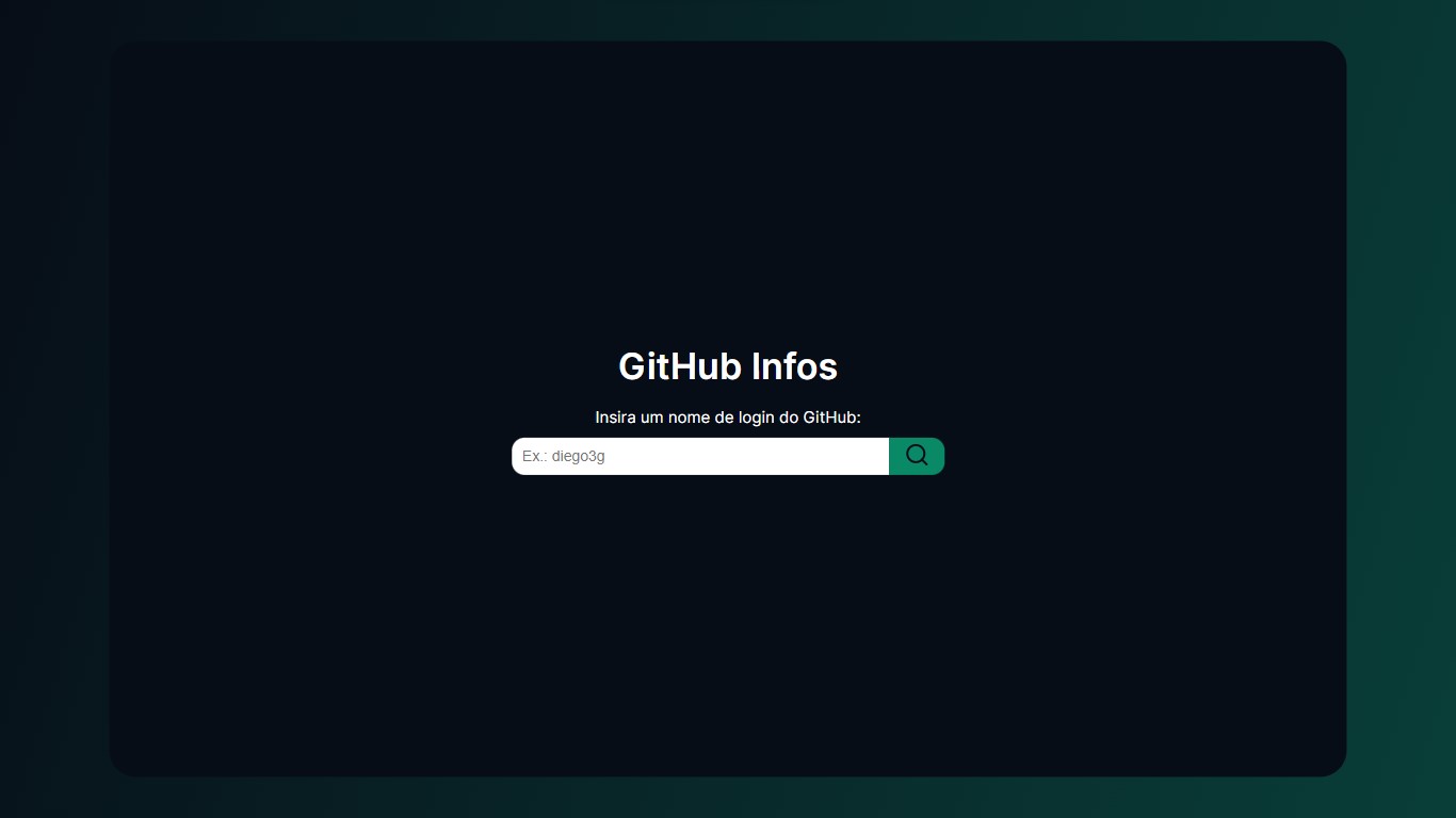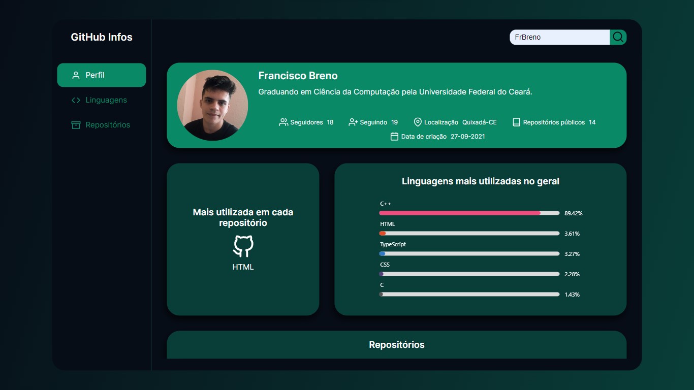 GitHub Infos é um pequeno projeto que possibilita aos seus usuários consultar algumas informações sobre o perfil de programadores no GitHub a partir do seu nome de login. Para isto, basta inserir na caixa de texto o nome de login e pronto! Você terá acesso às informações como o nome, descrição (bio), linguagens mais utilizadas, número e a lista de repositórios públicos criados, entre outros.