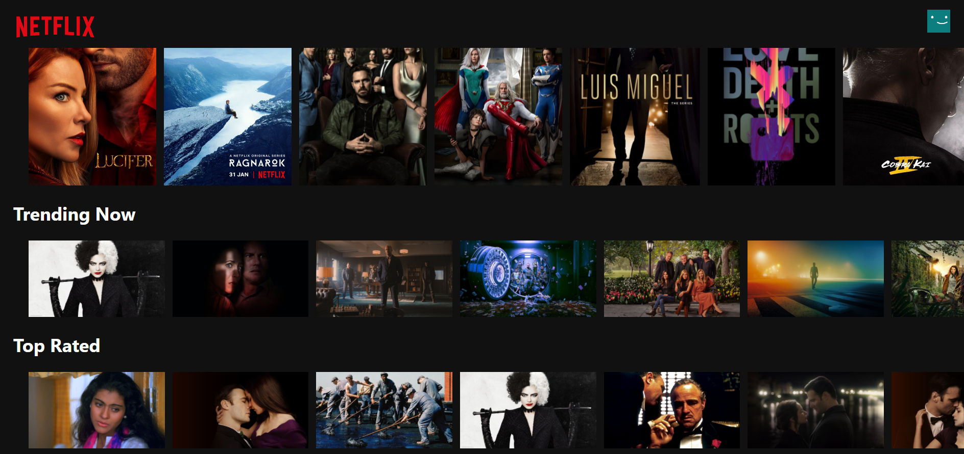 Fuzzy Netflix Clone is a simple clone of Netflix's home page built using ReactJS, Flexbox CSS for layouts and styling and MaterialUI for icons. It's a fully responsive web page and fetches all the details of the shows and movies from TMDB API. It also has the ability to play trailers for some of the TV Shows and Movies. The project is hosted live on Firebase.
