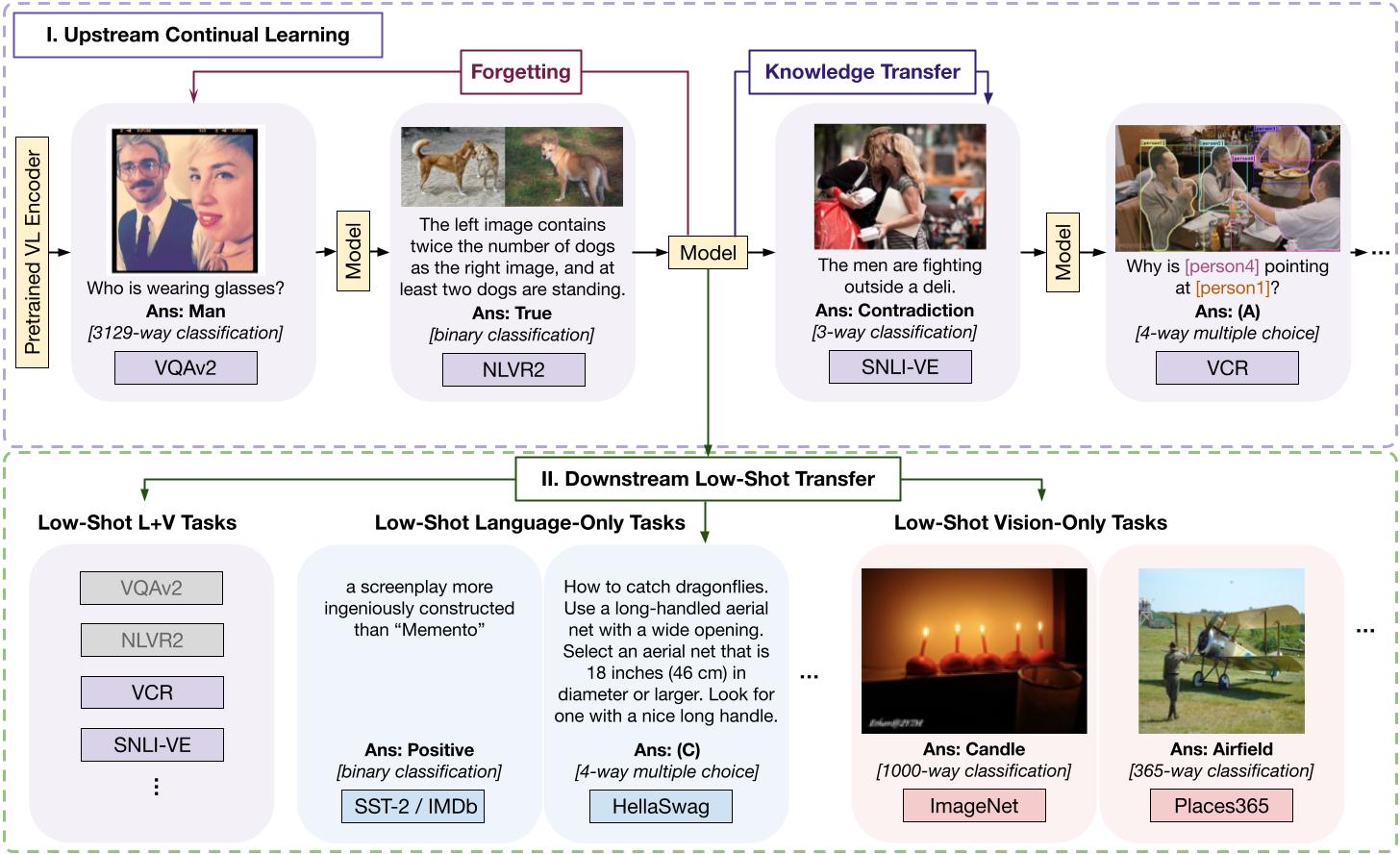 For low-shot multimodal transfer, the train/train_lowshot_multimodal.py script takes all the CL checkpoints from a single upstream CL experiment, and does low-shot transfer of each checkpoint to the unseen multimodal tasks (e.g. if the task order is VQAv2 -> NLVR2 -> SNLI-VE -> VCR, then the VQA checpoint is tuned on low-shot NLVR2, SNLI-VE, and VCR, whereas the NLVR2 checkpoint is transfered to low-shot SNLI-VE and VCR only. An example script can be seen [here](sh exp_scripts/lowshot_multimodal/vqa_nlvr_snlive_vcr/vilt-sequential_ft.sh).