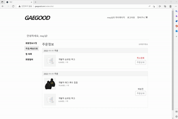 - 장바구니에서 주문을 진행하며, 주문 완료 후 조회 및 삭제가 가능함.