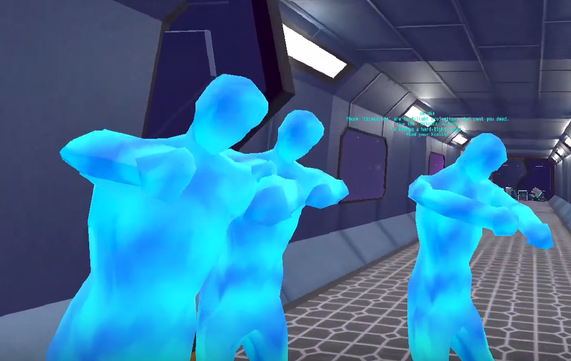 Enemies (“Exceptions”): The Exceptions are Hard Light Projections made by PALATINE. They are humanoid bodies the colour FutureSight technology blue. Their walking is deeply uncanny as they ramble towards the player, attempting to cause harm.