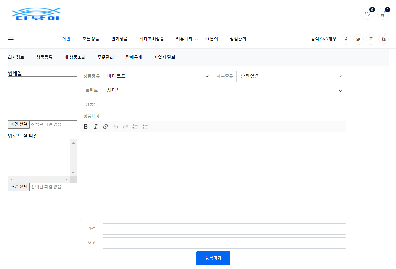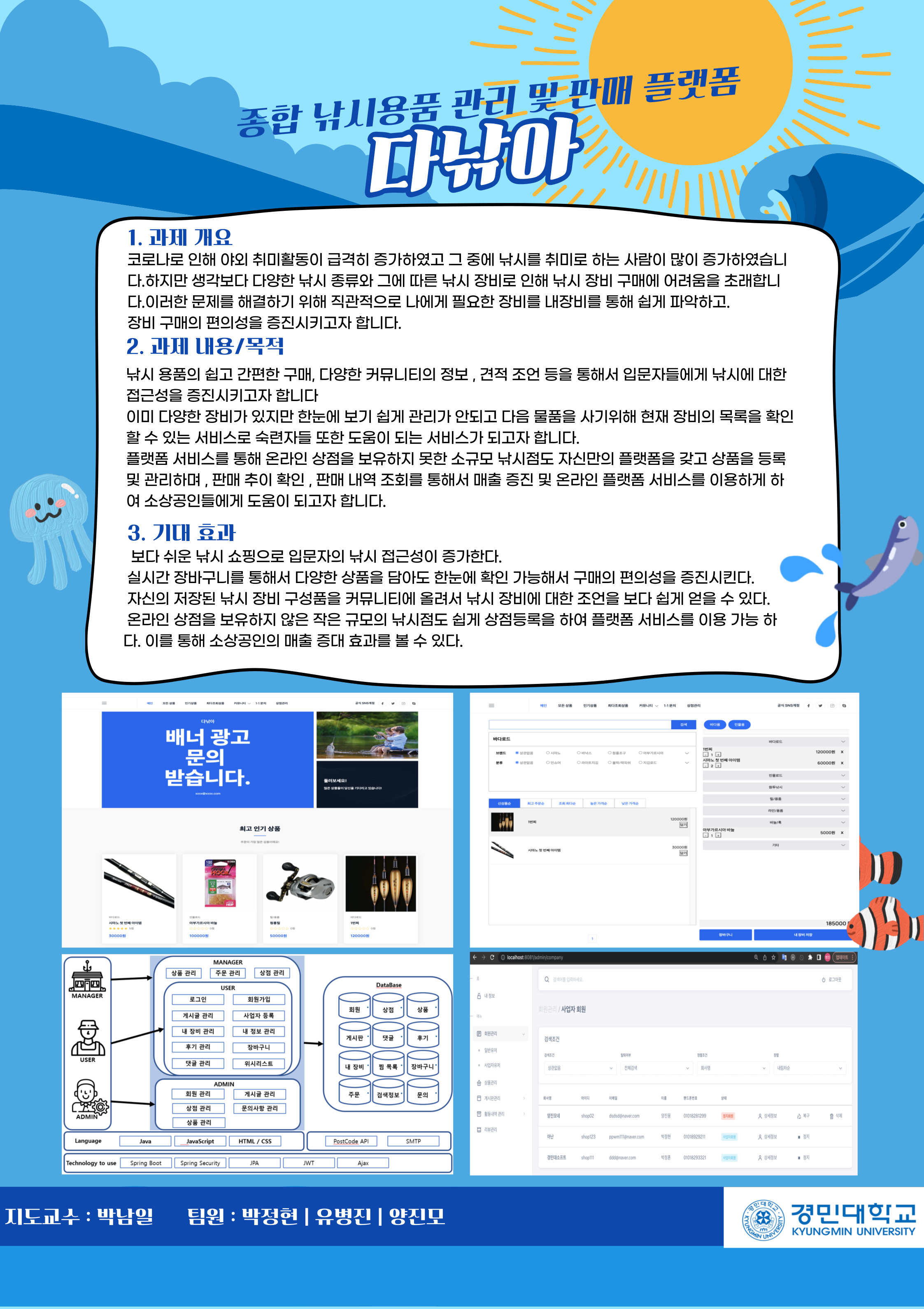 직접 상품을 등록 및 관리하며 판매 추이 확인, 내역 조회 등을 통해서 소규모 낚시점들의 매출 증진 및 온라인 서비스를 이용하여