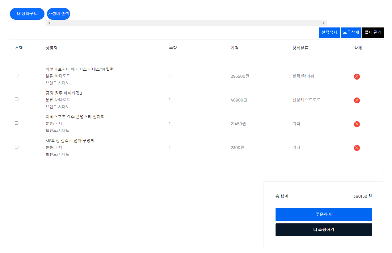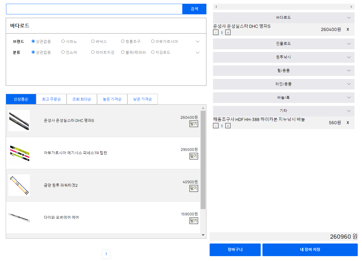 그리고 실시간으로 제품을 담는 즉시 구매 목록이 한 화면에 나타나 PC 부품처럼 다양한 낚시 상품을 한 번에 쉽게 담을 수 있습니다.