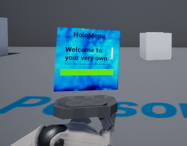 In this image it is a small watch that the player is holding showing them their current health and a little message welcoming them. I made it very small to still give the player ample room to see their surroundings.