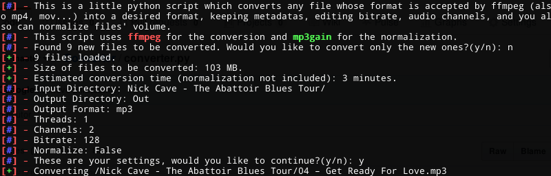 This is a little python script which converts any file whose format is accepted by ffmpeg (also mp4, mov...) into a desired format, keeping metadatas, editing bitrate, audio channels, and you also can normalize files' volume.