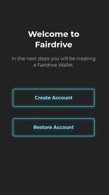 If no account is found on the device, Fairdrive invites the user to create or restore an account.
