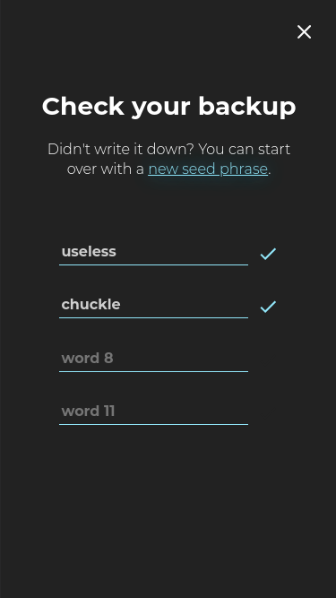 Before the user can continue, the app checks if the user has indeed backed up its mnemonic phrase.