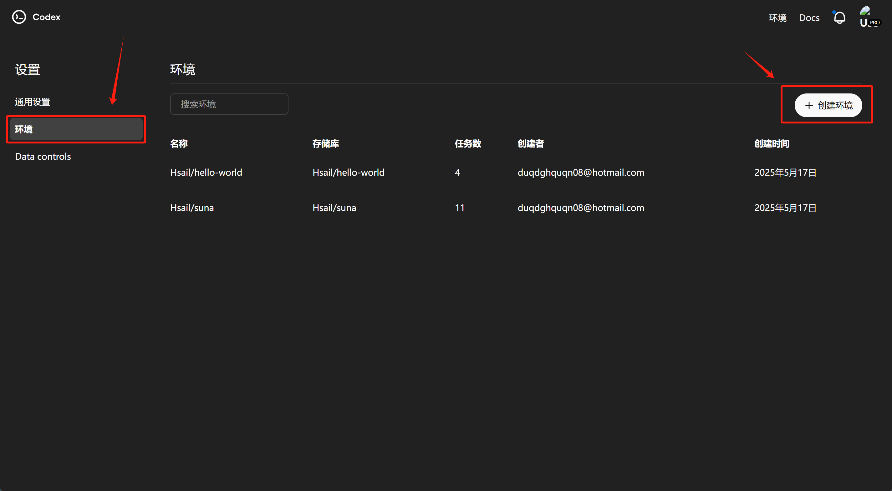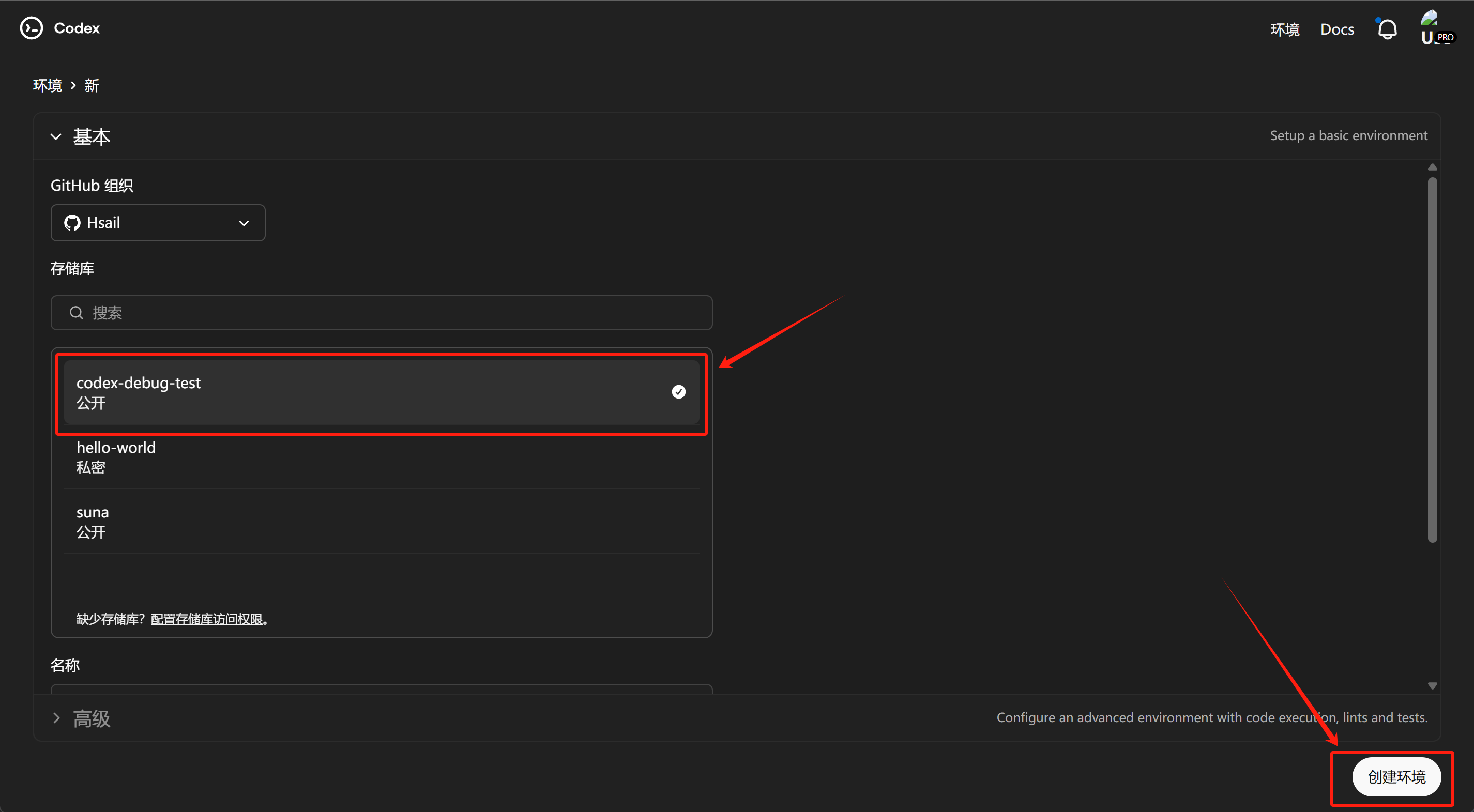 此时打开Codex,点击环境——创建环境,就能codex-debut-test项目了: