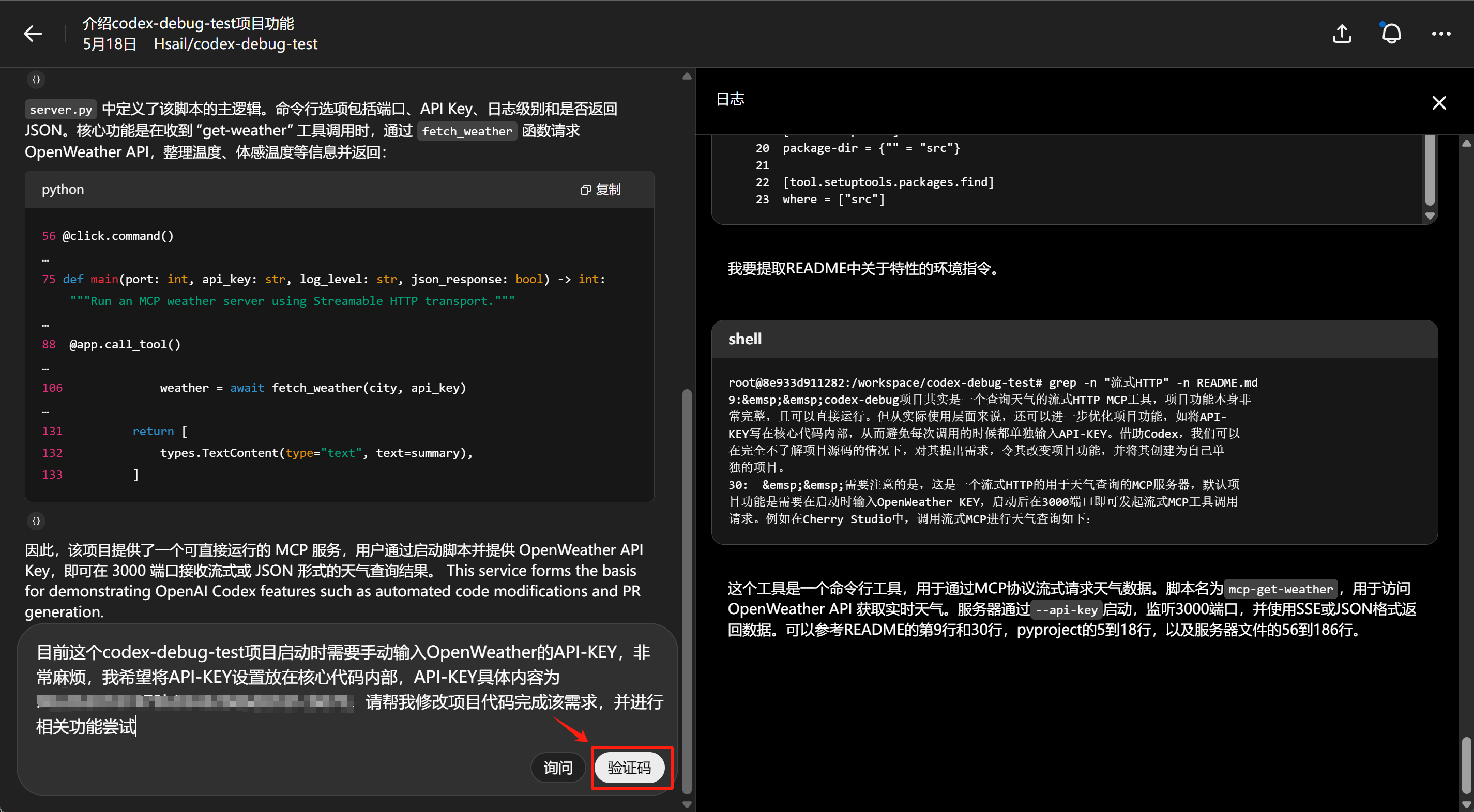 codex-debug项目其实是一个查询天气的流式HTTP MCP工具,项目功能本身非常完整,且可以直接运行。但从实际使用层面来说,还可以进一步优化项目功能,如将API-KEY写在核心代码内部,从而避免每次调用的时候都单独输入API-KEY。借助Codex,我们可以在完全不了解项目源码的情况下,对其提出需求,令其改变项目功能,并将其创建为自己单独的项目。