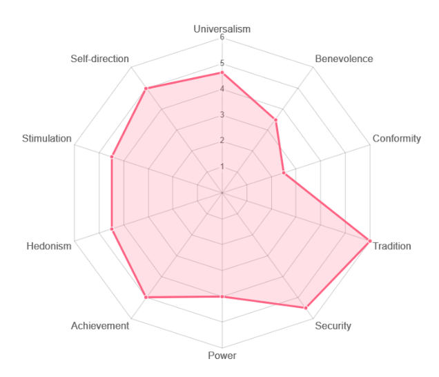 This webpage not only analyzes PVQ results, but also visually provides Reddit users' results and stores them. The user can check his/her results in a chart and download them as an image file. It also shows definitions and examples for each of the 10 values.