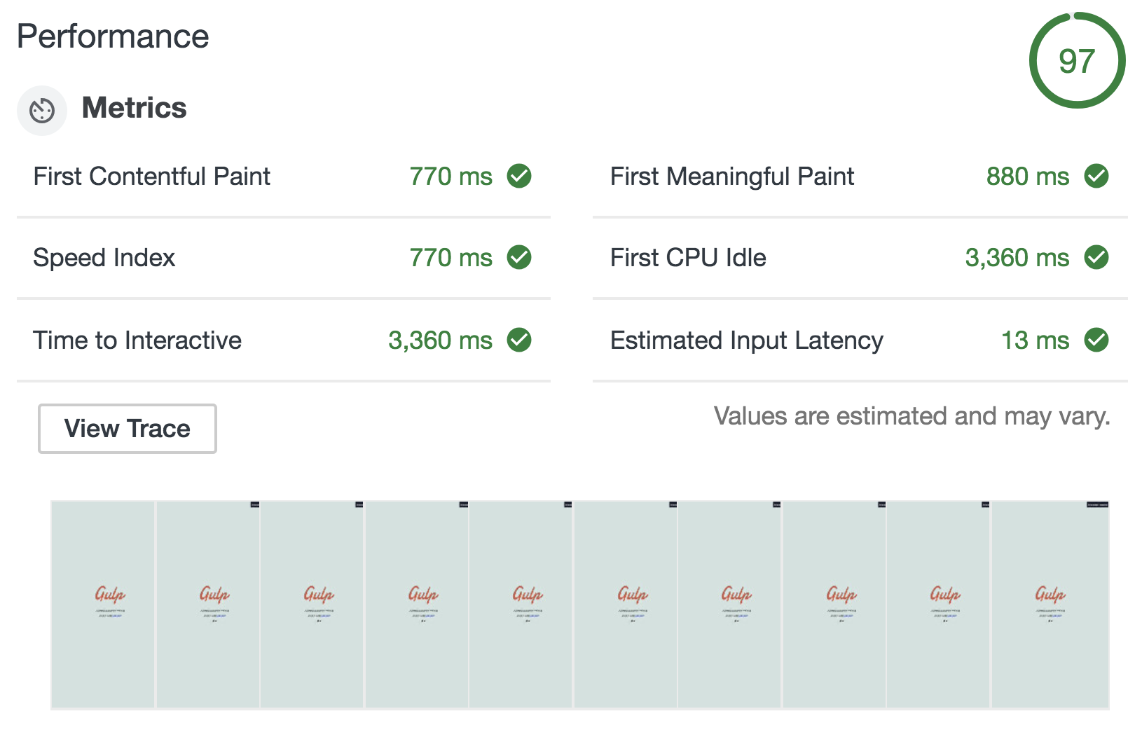 This is the result of performance tests (97%) within Lighthouse for Production Mode. It's Not excellent (yet!), but still quite good actually.