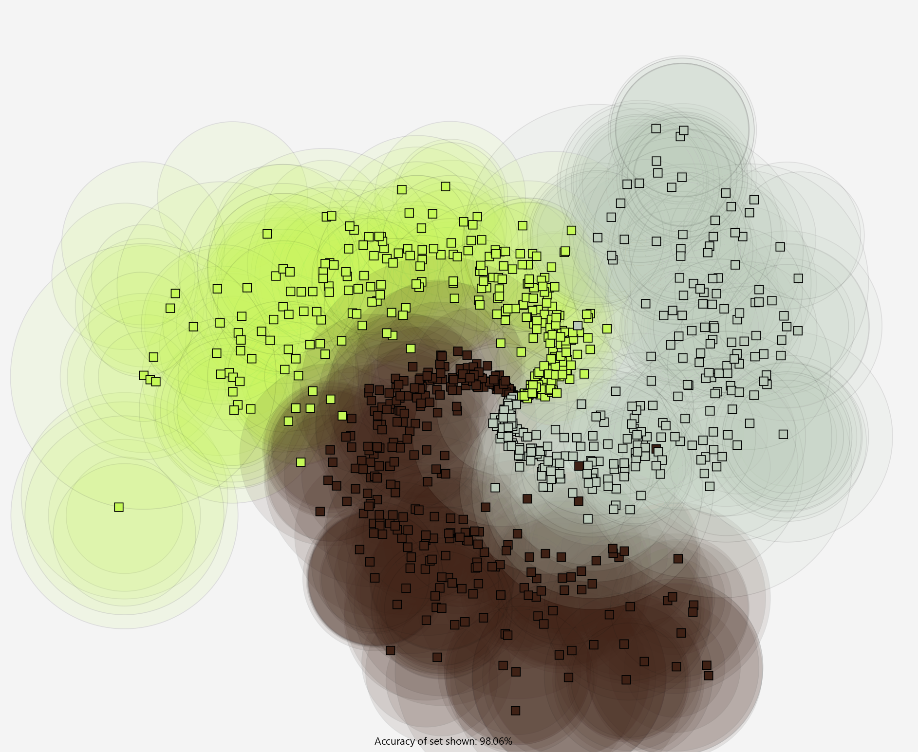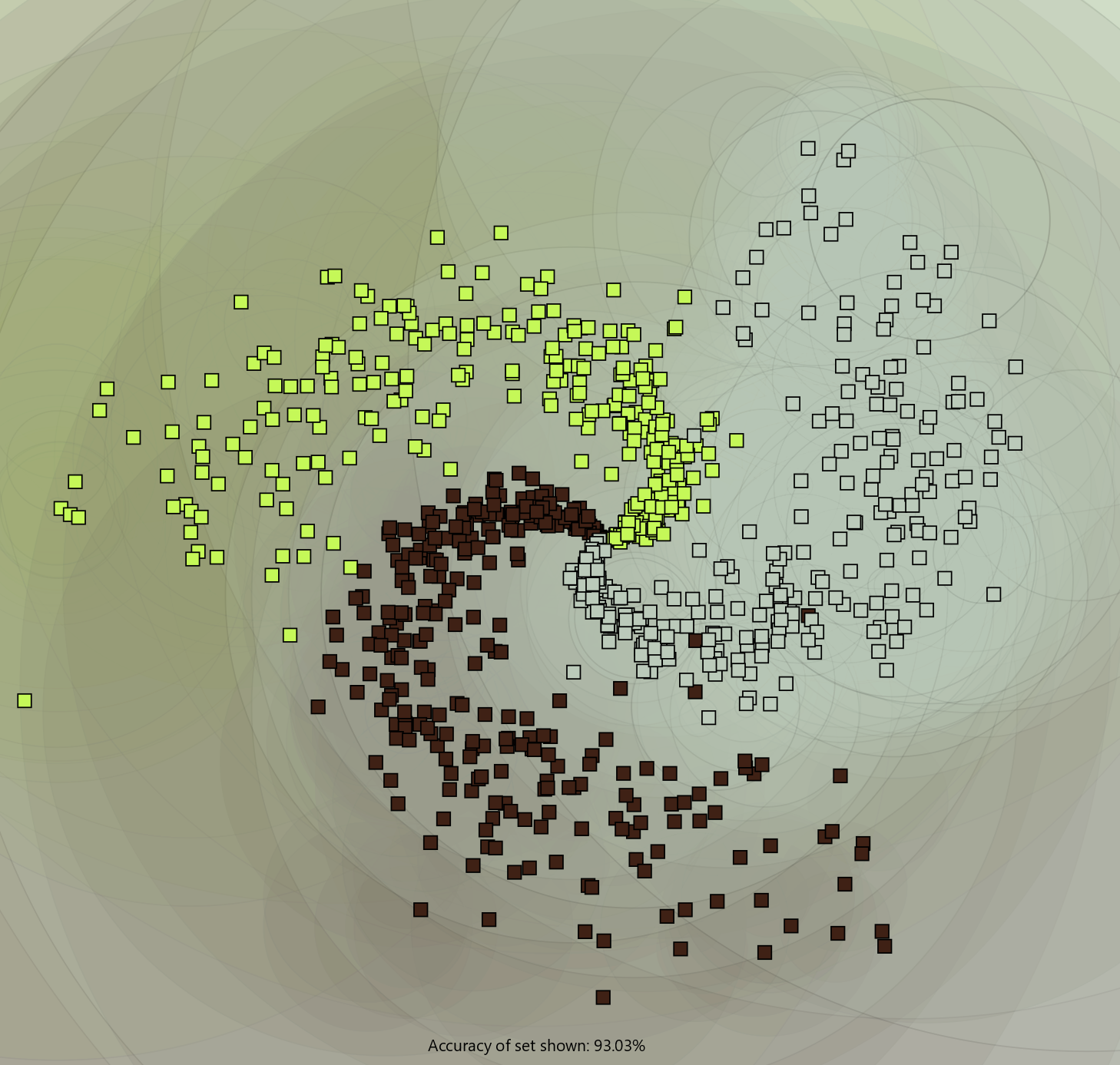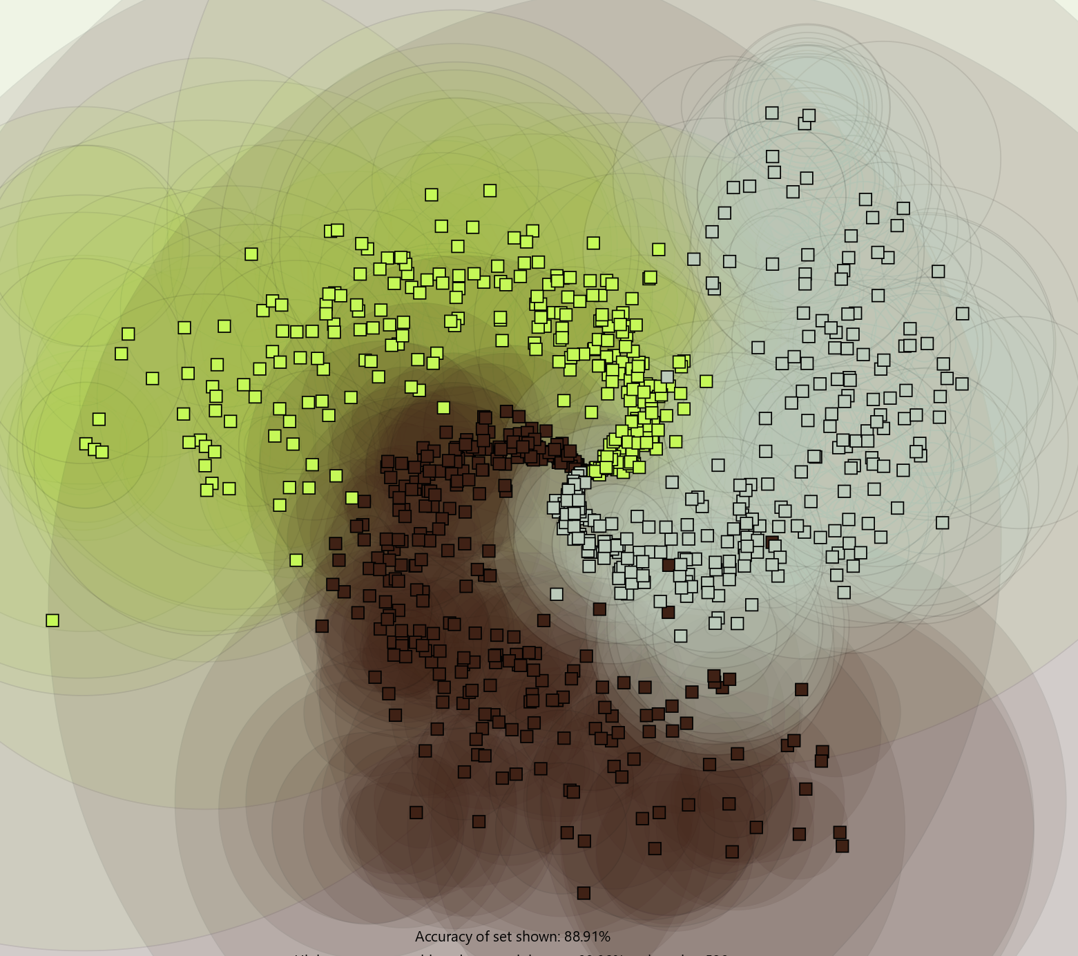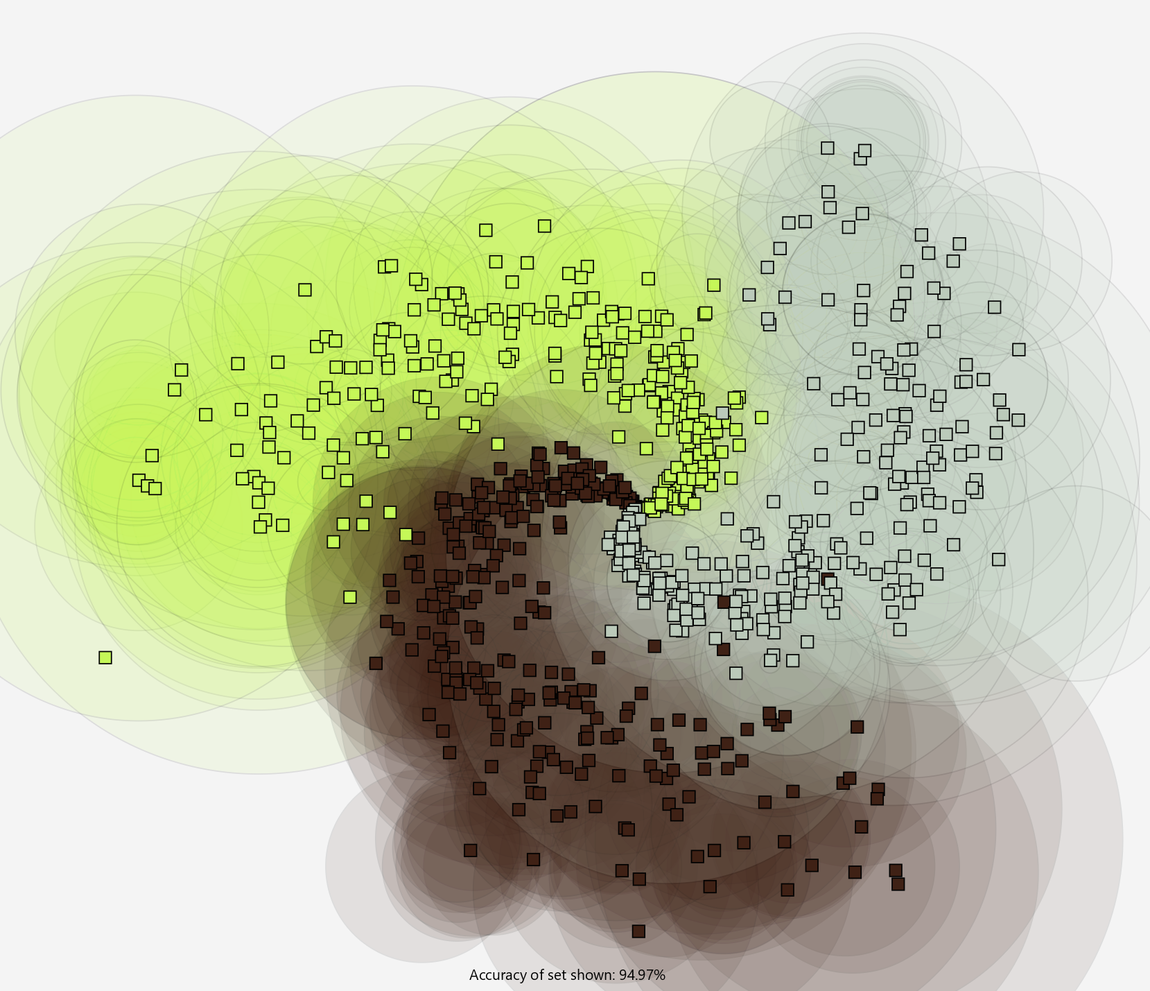 Here the antibodies are plotted as their recognition regions being colored circles. The antibody will classify any antigen within its recognition region as its own class. Antigen are plotted as squares.