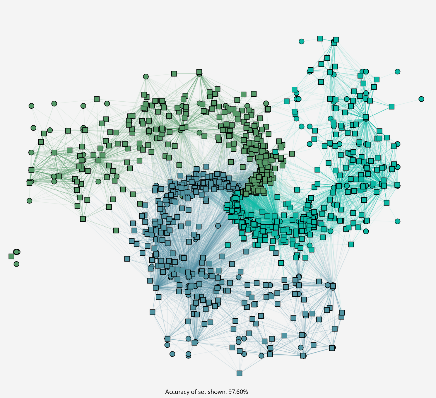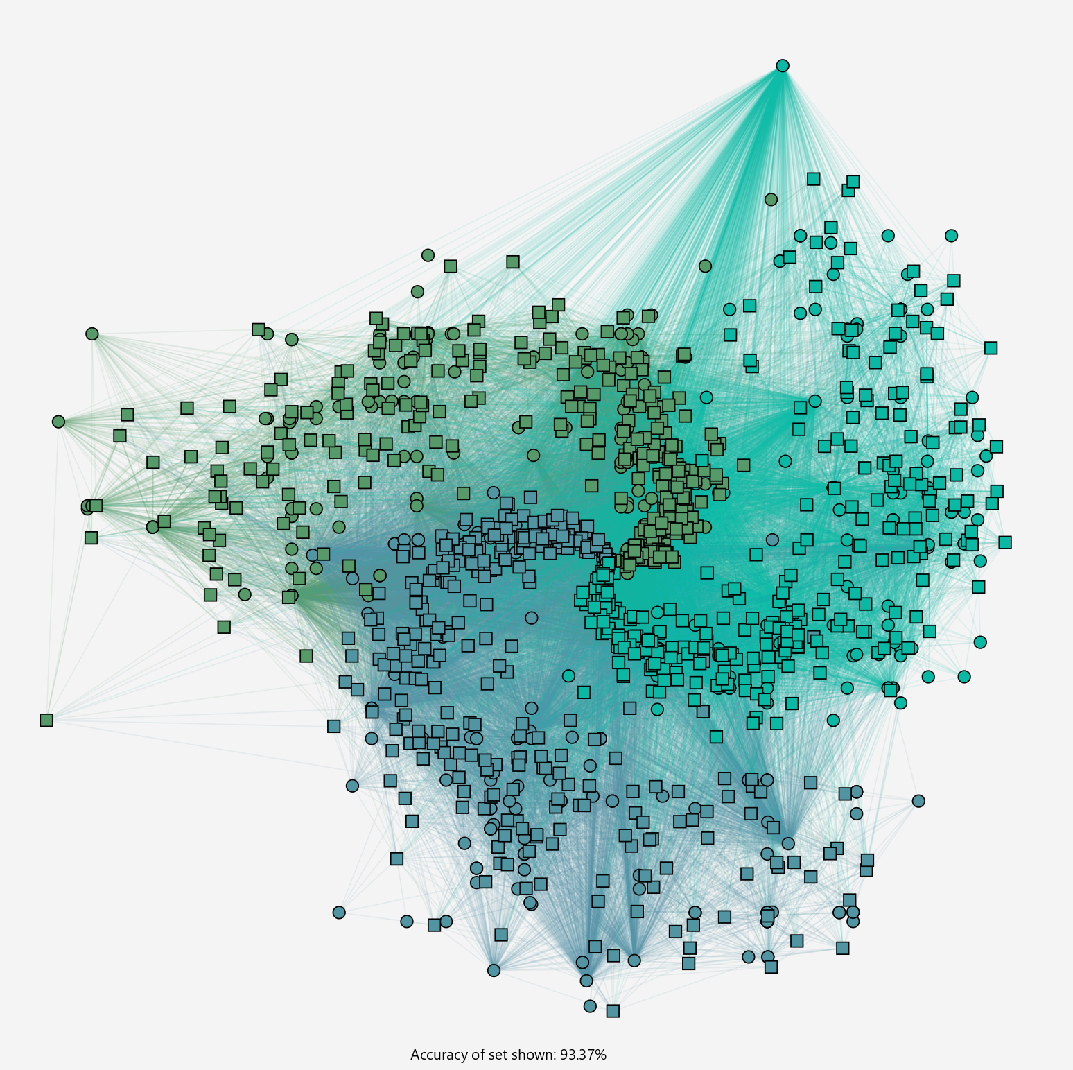 Antibodies are the circles, while the antigen (training cases) are the squares. Different classes are depicted with different colours.