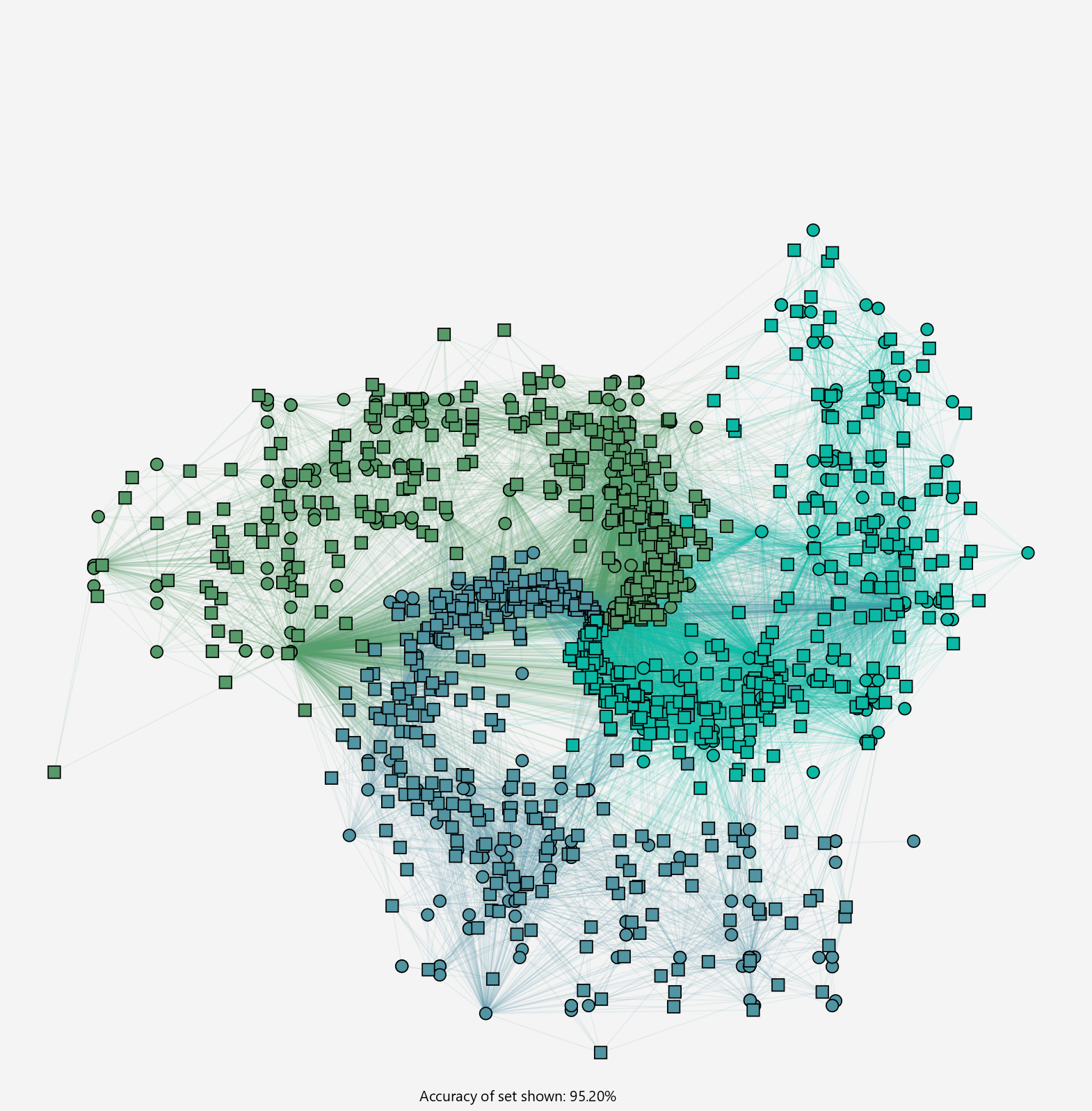Here the antibodies are plotted as small colored circles while while antigens are still plotted as squares. The colored lines are connections from the antibodies to all the antigens they are connected to.