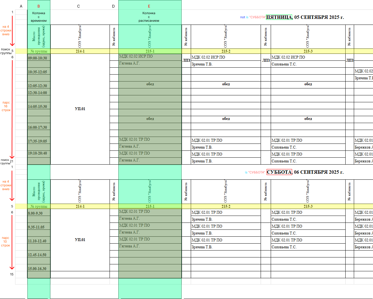 Файл расписания ЕПК построен шаблонно: для будней выделено 16 строк, а для суббот - 10.