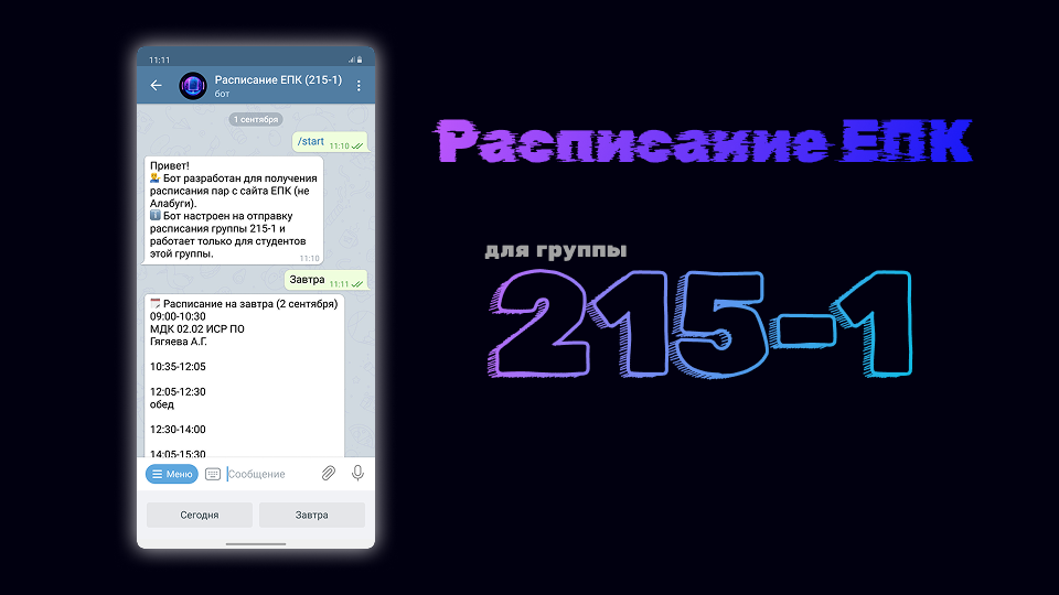 Отправка расписания на сегодня/завтра: Пользователи могут запросить расписание на сегодня или завтра с помощью команд /today и /tomorrow или кнопок на клавиатуре.