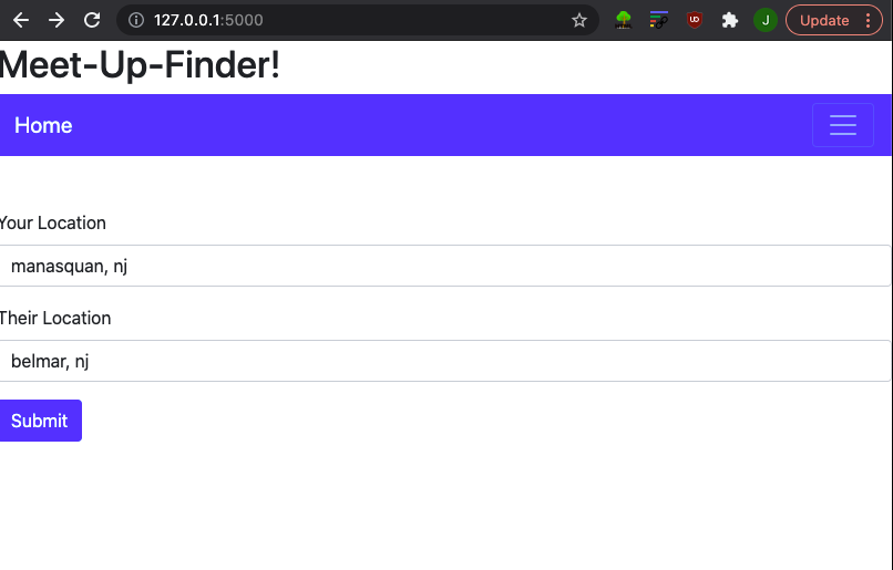Enter two locations into the form, your location and the location of whom you are going to meet with. Then Meet Ups will produce an interactive map image with those two points marked out.