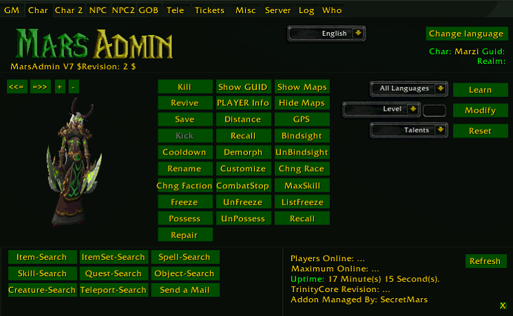 MarsAdmin v7 is a general interface add-on which will help staff member ingame for trinity core, its based on TrinityAdmin, which is based on MangosAdmin.