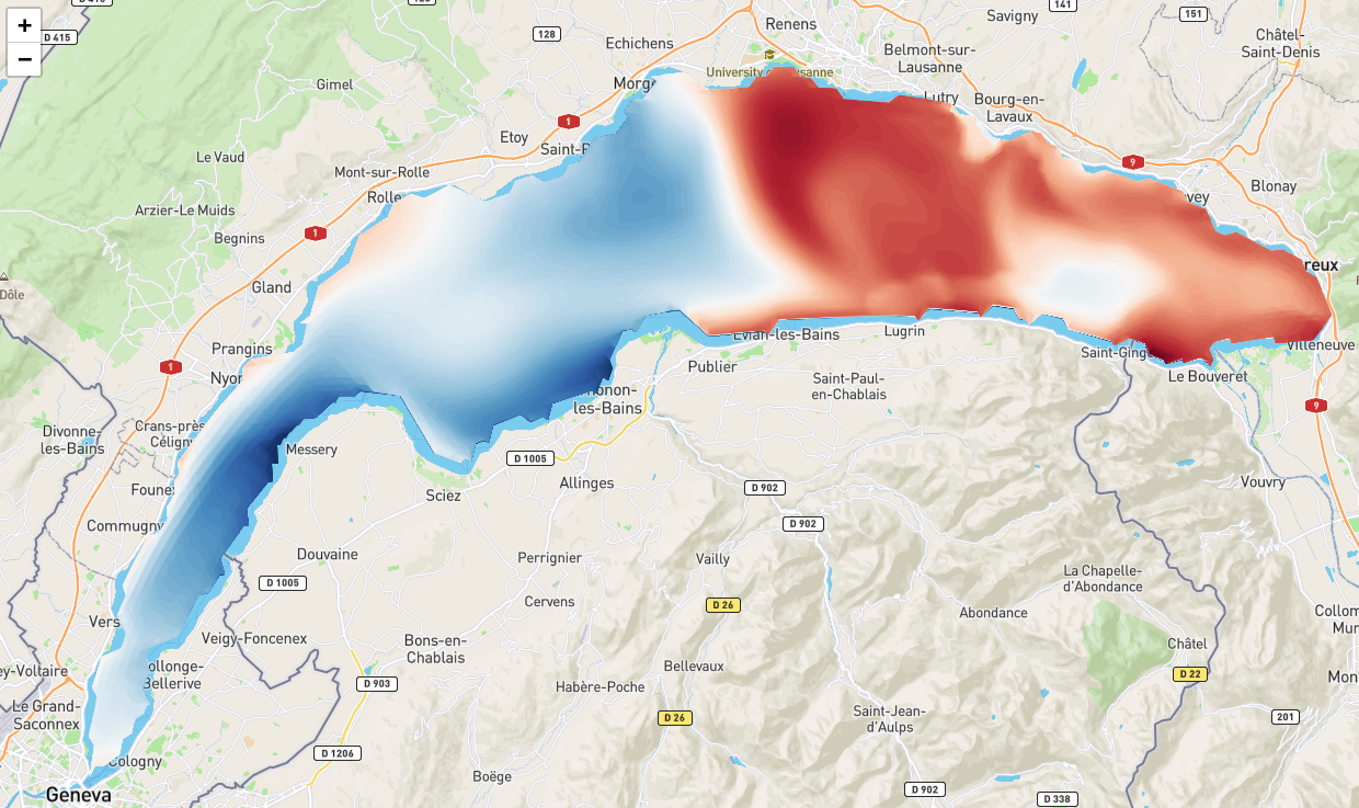 Grid of simulated water temperature values on Lake Geneva from the Meteolakes project, plotted as filled contours.