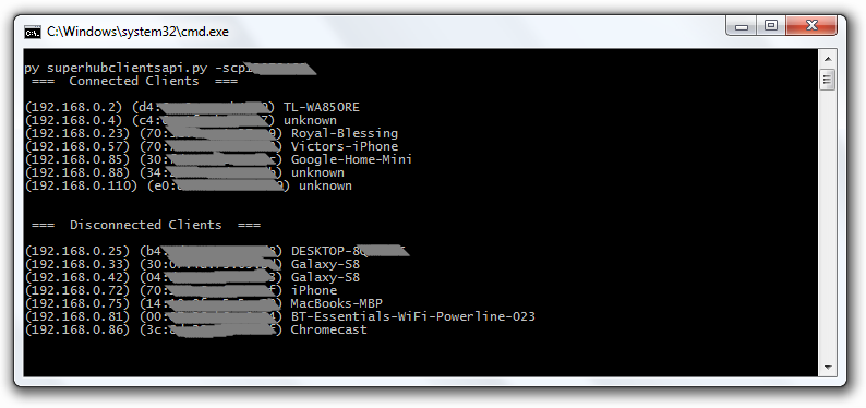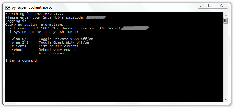 A command-line interface for managing the VM SuperHub 3/ARRIS TG2492S/CE router. Allows listing current/past connected devices, toggle private/guest WLAN, rebooting and viewing router status.