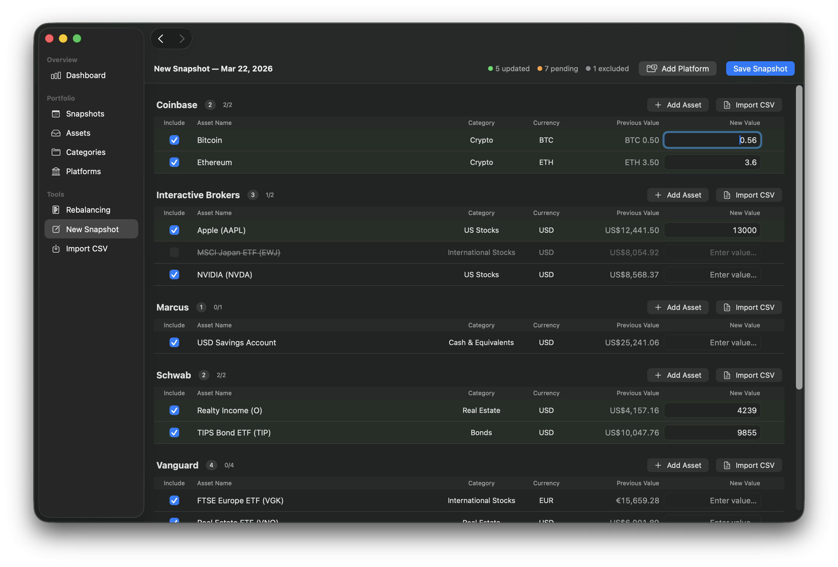 ImportViewModel+Helpersnow allows CSV import to overwrite zero-value assets in existing snapshots (deferred from bulk entry pending rows)Utilities