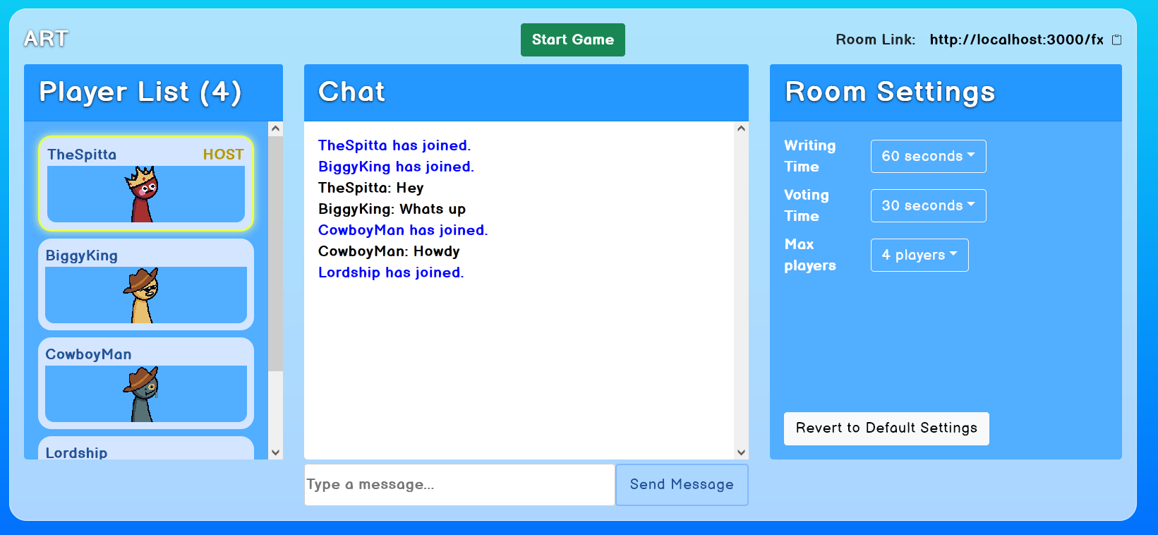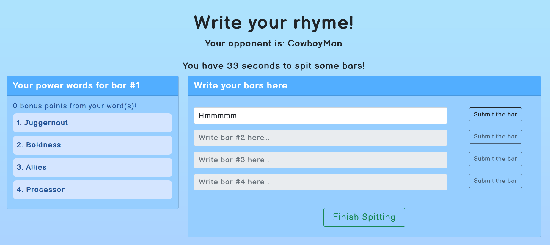 After the time is up, everyone's rap is displayed and played with text-to-speech, using the Responsive Voice API. After each round, all players will vote on the rap they thought was the most clever or funny. And that's mostly it! This repeats for a number of rounds, and the player with the most points at the end is deemed the winner.