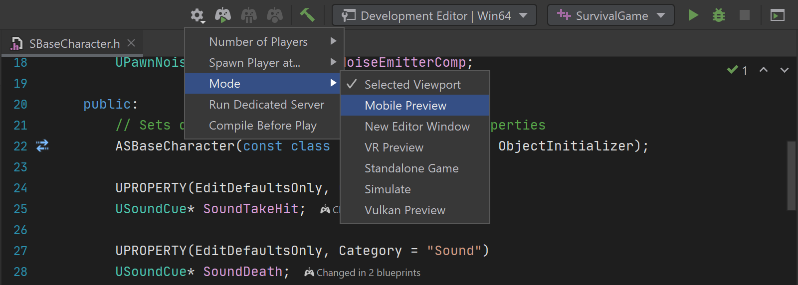 The plugin allows you to manage your game right inside the IDE: select the running mode, run a server for your multiplayer game, specify the number of players, and more.