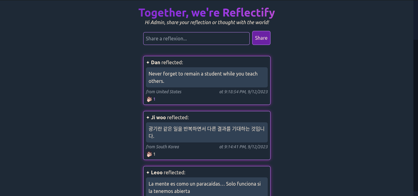 Reflectify is an app where users can create their accounts and view and share comments, ideally a reflection or any thought they want and also can 'applause' reflections.