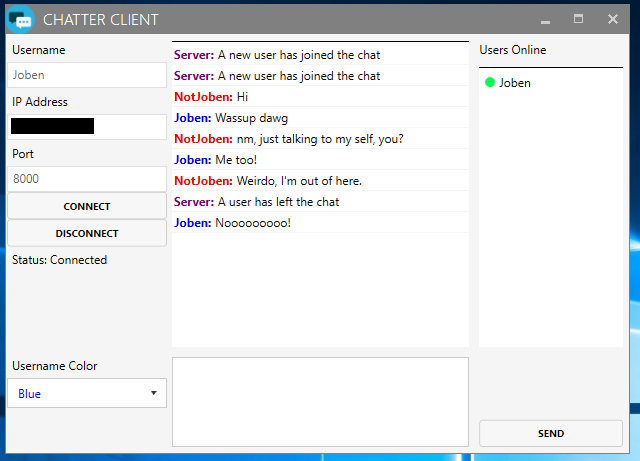 WPFChat A WPF chat application using TCP sockets. Theme in the application is MahApps: http://mahapps.com/ Icons in the application are from: https://www.iconfinder.com Images
