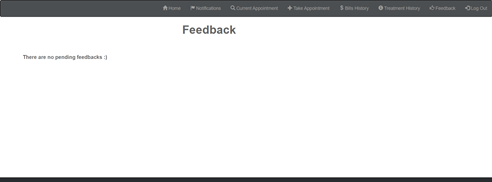 SIGNUP Login Module • Users have to login using their registered credentials to access the lessons. Registration Module • Users have to register/create an account with their personal details and a unique User name and valid email address. HOME PAGE PATIENT • Patient Home – Patient can view his profile • Current Appointment – Patient can view if he has some pending or approved appointment with a doctor • Bills History – Patient can view the bill history of appointments that have been completed • Treatment History – Patient can view the treatment history of appointments which have been completed • Take Appointment – Patient can view all the departments, and then can select one dept. Then the doctors of that dept are shown. Then patient selects one doctor and the doctor’s profile is then shown along with a ‘take appointment’ button. When the button is clicked, the free slots of that particular doctor are shown. Patient selects a free slot of his choice and then sends request for that free slot to the doctor. The doctor will then approve/reject it. • Notifications – In this tab, a notification is shown whenever the doctor accepts/rejects the requested appointment. • Feedback – After a appointment is completed, patient can give feedback about that appointment by rating it from 1 – 5 • A patient can request for only one appointment at a time and will not be allowed to take more than one appointments until the last appointment has been completed. Doctor: • Doctor Profile: Doctor can see his own profile • Pending Appointments: Doctor can see all the pending appointments against his doctor ID. • Today’s Appointments: the appointments for current day will be shown. The doctor then can select/reject any appointment of that day • History Update: He can update prescription, disease and progress of patient Generate Bill: He will then generate the bill • Patient History: Doctor will be able to see the treatment history of all his treated patients. Administrator: • Admin Home: Admin can view Clinic stats which includes weekly appointments, income of the Clinic. No of registered patients and doctors along with the list of departments • View Doctors: Admin can view the list of doctors currently registered along with their departments and other information. Complete profile will be shown when clicked. • View Patients: Admin can view the list of patients currently registered along with their phone numbers and ids. Complete profile will be shown when clicked. • View Other Staff: Admin can view other staff members along with their designations. • Search Box: Admin can search for a specific employ within the company by name • Add/Remove: Admin can Add/remove doctors patients and other staff members form the clinic.