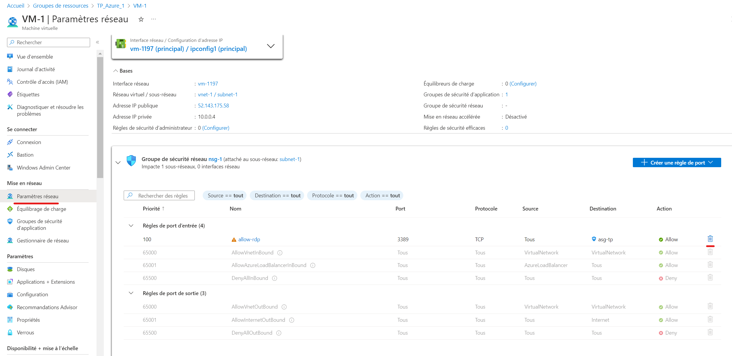 - Se rendre https://portal.azure.com/#view/HubsExtension/BrowseResource/resourceType/Microsoft.Network%2FNetworkSecurityGroups (dans groupe de sécurité réseau)