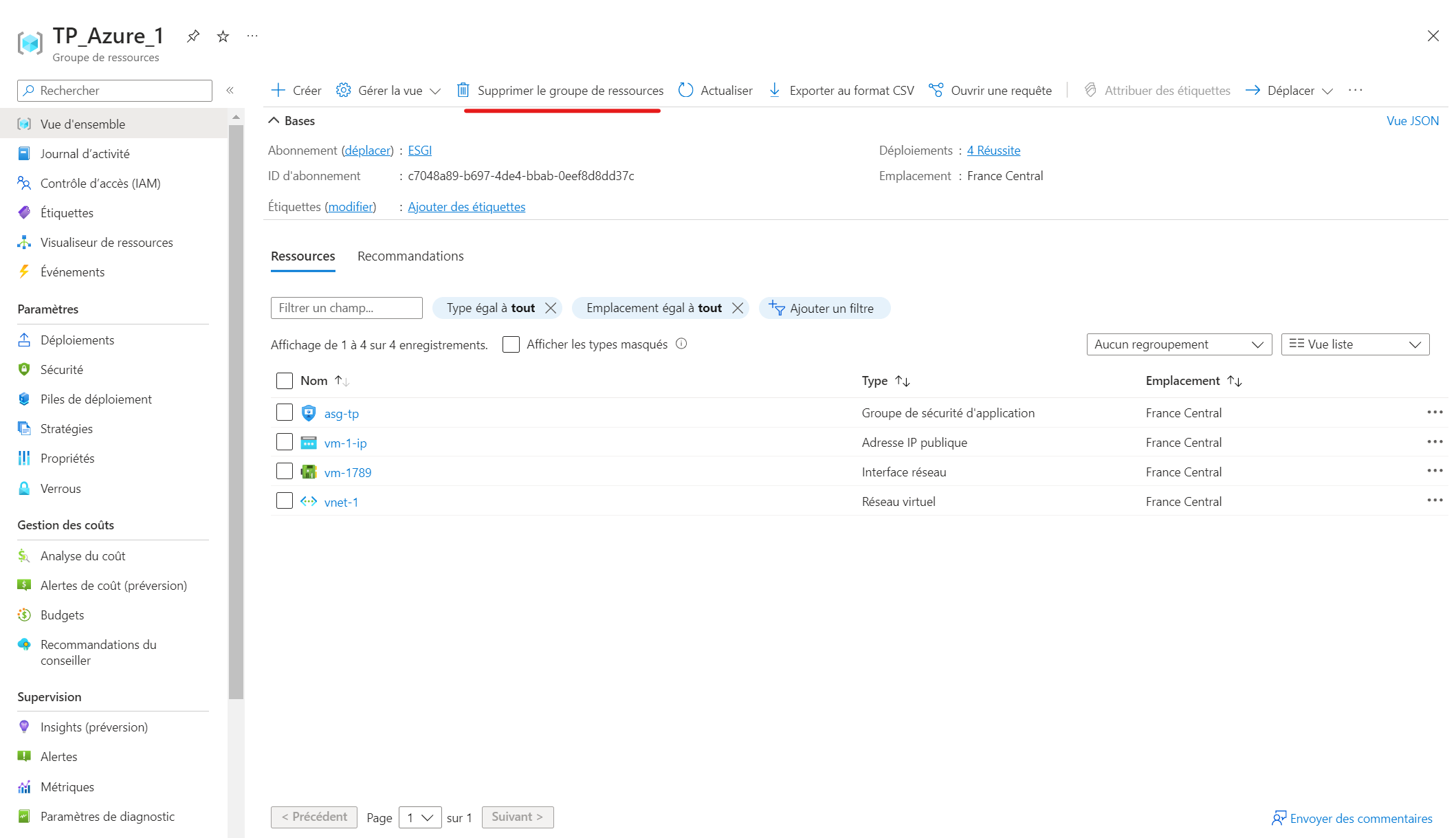 Nous vous conseillons fortement de supprimer vos ressources car comme vu pendant le cours, le paiement se fait à l'utilisation. Vu que nous avons terminé le TP, vous pouvez supprimer. Pour cela, rien de plus simple il suffit de suivre les étapes suivantes :