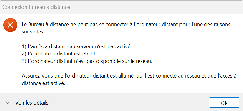 Si vous avez bien suivi toutes les étapes, vous devriez obtenir une erreur lorsque vous tentez de vous connecter en RDP à votre machine virtuelle.