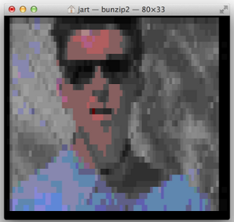 Kudos to jart for our lovely hiptext shenanigans. Please see our sister project: hiptext, which generates ANSI color codes for any image or video.