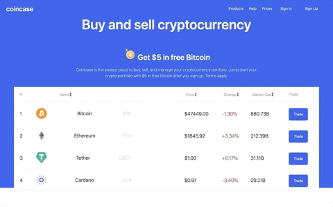 Coincase is a clone of the cryptocurrency trading site Coinbase. Coincase allows users to track, buy and sell cryptocurrencies.