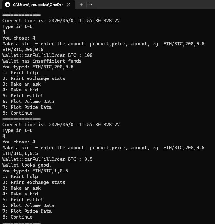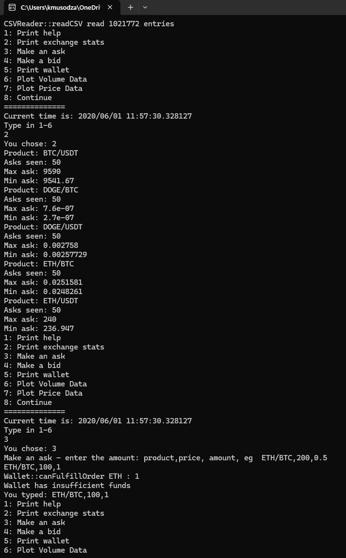 This project implements a trading matching engine with added functionality for visualizing market data using candlestick graphs. The matching engine facilitates the trading of various cryptocurrency pairs by allowing users to place bids and asks, view exchange statistics, and analyze trading data through text-based plots.