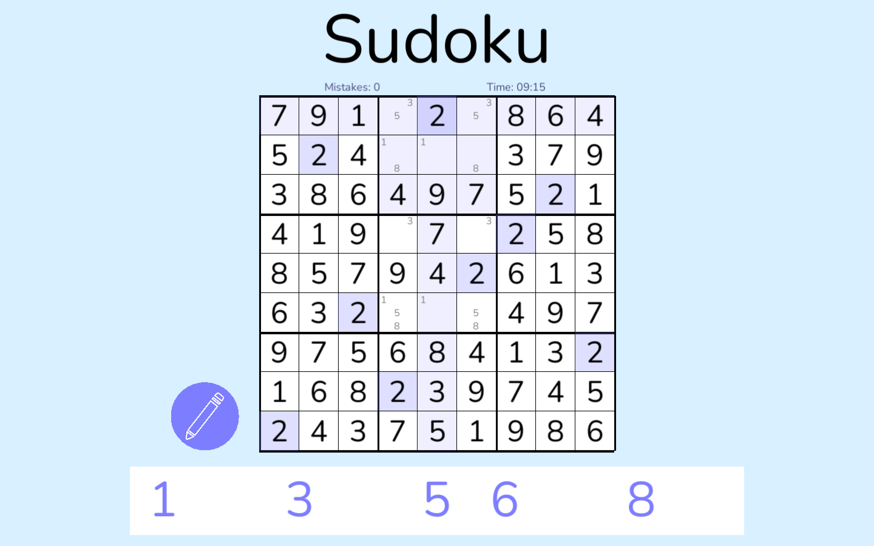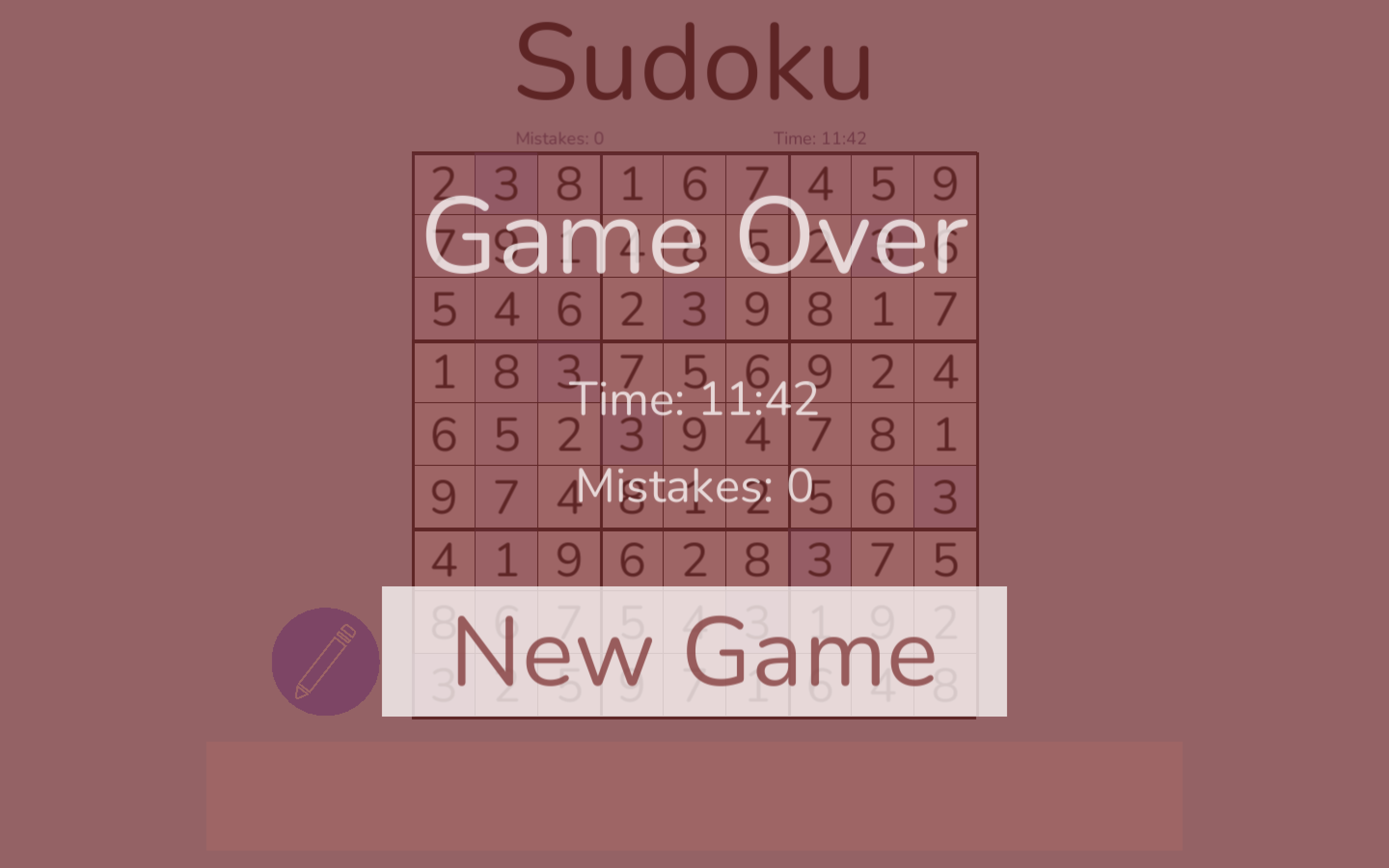Sudoku Final project submission for the Harvard CS50x course To test and play this game, you must install LÖVE, then run the Game.love file. Some screenshots if you're interested: Main Screen Randomly Generated Game Game with some pencilmarkings and a mistake Mostly complete game with pencilmarkings A completed game of Easy difficulty A completed game of Medium difficulty A completed game of Hard difficulty
