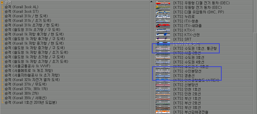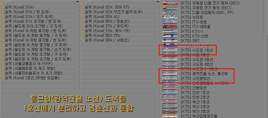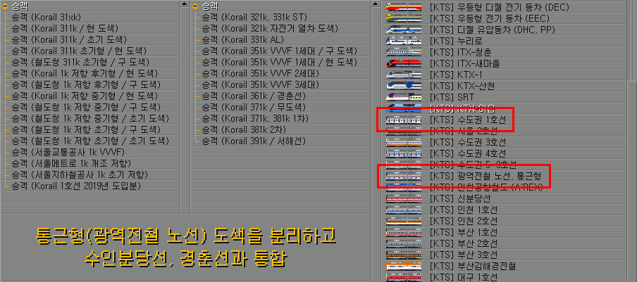 321K_BIKE,371K_381K_1ST,371K_BLANK,381K_2ND,391K,3XXK_AL,3XXK_ST를 별도 분리3XXK_ST는 분당선에 4호선 VVVF 1세대 도색을 추가 #156, [add] 4호선 GEC 초퍼제어 전동차 #230 의 사례와 같이 Korail 31xk와 Korail 321k, 331k ST로 분리하나 스프라이트는 공유도색개조가 없는