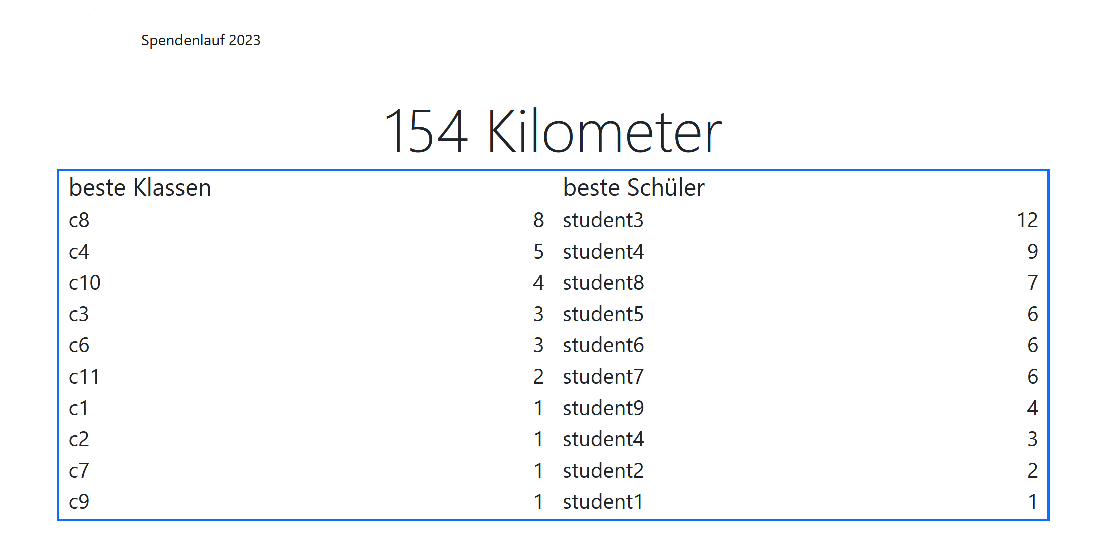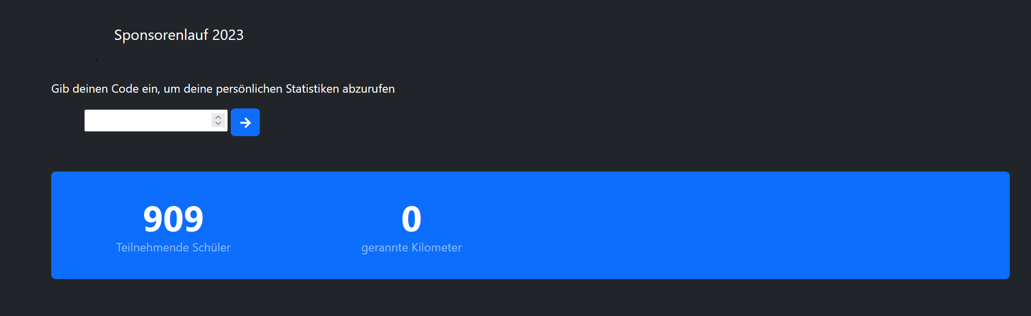 /: Main page to view personal stats with the participant codestats/'code': Display stats (you'll get redirected from main page)/leaderboard: Live score board/admin: Django admin panelapi/create/'name'/'class'/'code': Endpoint to create participant objectapi/createklasse/'name': Endpoint to create class objectapi/scanned/'code': Endpoint to add a round to a participantapi/start: Endpoint to reset all stats and start the timers for the first roundapi/test: Endpoint to test if the API key is validapi/leaderboard: Get score board data for other application (only returns data when updated)api/leaderboardforce: Get score board data for other application (always returns data)api/meter/'code': Get personal stats for export