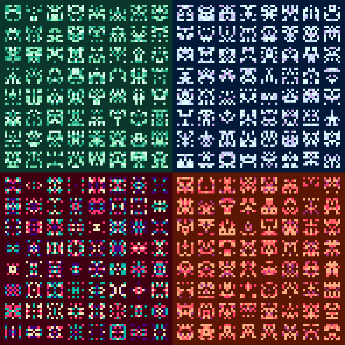 import{randpix,RandpixColorScheme,Symmetry}from'randpix'constgenerate=randpix({colorScheme: RandpixColorScheme.DARKULA,// Color theme (default: NEUTRAL)size: 8,// Art size. Recommended 7 or 8 (odd/even symmetry) (default: 8)scale: 32,// Pixel scale (default: 1)symmetry: Symmetry.VERTICAL,// Symmetry (default: VERTICAL)color: [255,100,50],// [R, G, B] like color for solid art (default: undefined),seed: 'Some string',// Seed (default: undefined)colorBias: 15,// Slightly changes the color hue, which adds more color to the image (default: undefined)grayscaleBias: false// Change only the brightness of the color instead of the hue (default: undefined)})constart=generate()// Generating the pixel artconstpngBuffer=art.toBuffer('image/png')constdataURL=art.toDataURL()