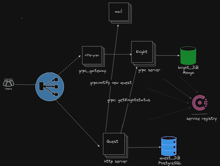 Go microservice, organized in a monorepo structure using gRPC to facilitate interactions between services.The medieval themed system is designed to demonstrate how these technologies can be integrated to build a scalable and efficient distributed architecture.